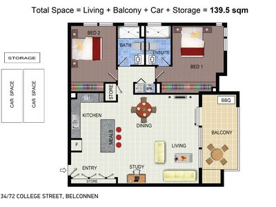 Total Space = Living + Balcony + Car + Storage = 139.5 sqm