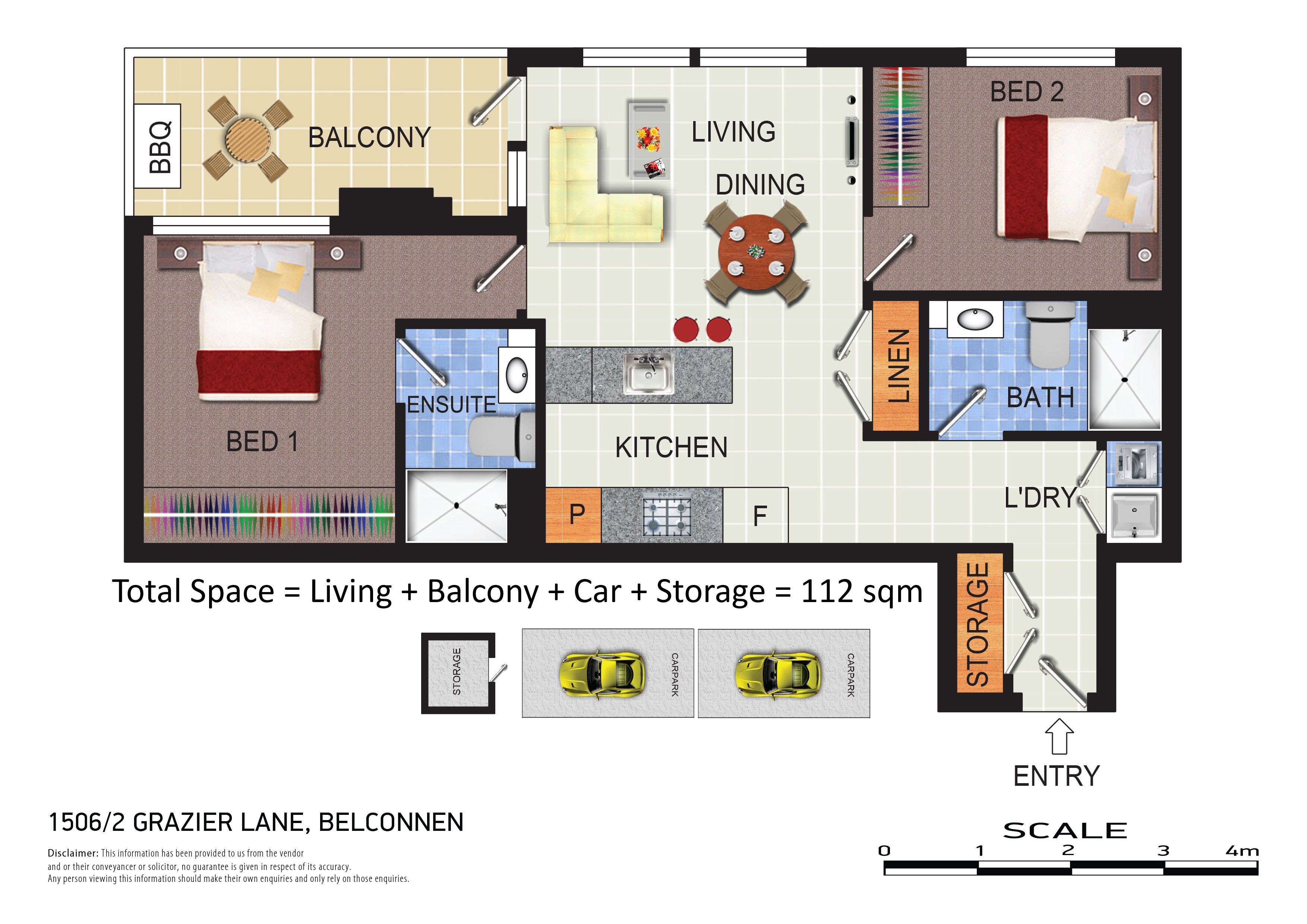 Total Space = Living + Balcony + Car spaces + Storage = 112 sqm
